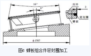 蝶板組合件起密封作用的零件是密封圈,密封圈為斜錐結(jié)構(gòu),其錐頂角為16°,厚度為13.5mm,由5層石棉板及4層不銹鋼板復合而成(圖6)。密封圈必須與蝶板和壓環(huán)等組裝在一起,加工時才能防止密封圈夾層中的不銹鋼板及石棉板翹曲變形。根據(jù)其結(jié)構(gòu)特點,對蝶板組合件密封圈采用以下加工方法:(1)先在2.5m立車上分別把蝶板和壓環(huán)上的各止口加工到圖紙要求尺寸,外圓不加工;(2)按圖紙要求對壓環(huán)鉆孔,蝶板鉆孔攻絲;(3)壓環(huán)、密封圈和蝶板按圖紙裝配,將蝶板組合件工裝用螺栓緊固在閥體工裝上,然后再將蝶板組合件裝夾其上。立車刀桿旋轉(zhuǎn)8°車壓環(huán)、密封圈和蝶板至磨削尺寸;⑷用同樣厚度鋼板替下密封圈,車壓環(huán)、蝶板各錐面至圖紙尺寸;(5)工裝不動,將壓環(huán)、密封圈、蝶板重新按要求組裝,然后在立車刀架上裝磨頭,對密封圈進行磨削處理,使其達到圖紙設(shè)計粗糙度要求。