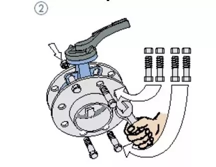 1、如所示,將閥門放置于預(yù)安裝的兩片法蘭之間,注意螺栓孔要整齊對齊。